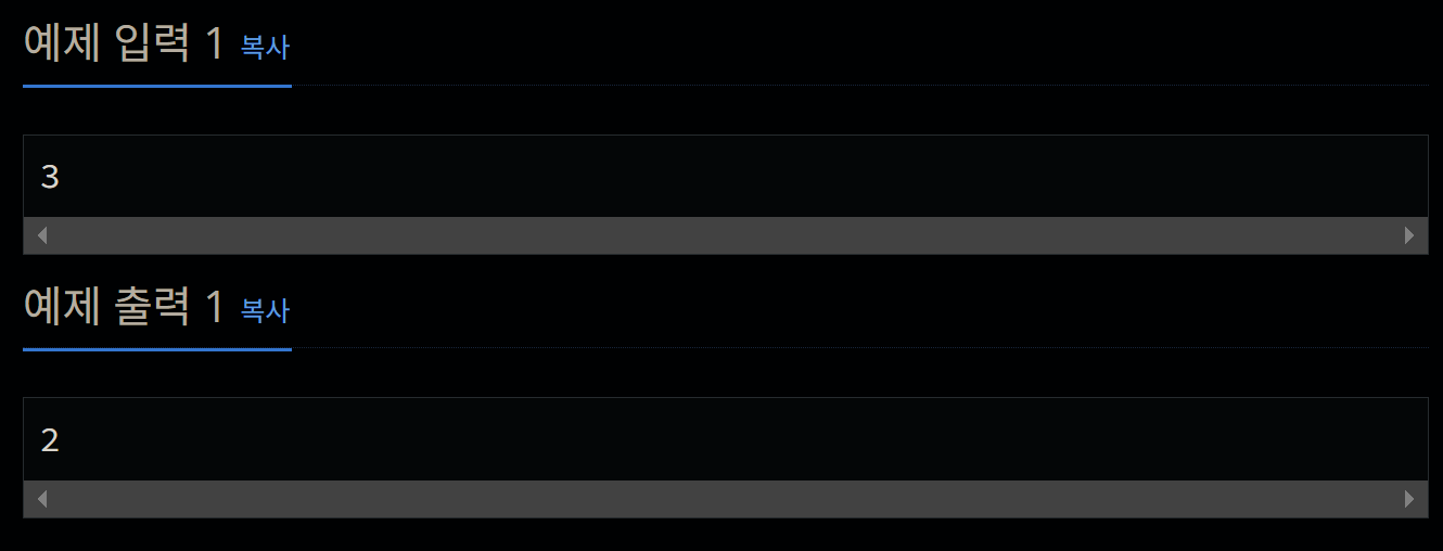 해답 #include <iostream> #include <vector> #include <algorithm> using namespace std; int total = 0; int main() { int N; cin >> N; vector<long long> dp(N); dp[0] = 1; dp[1] = 1; for (int i = 2; i < N; i++) { dp[i] = dp[i - 1] + dp[i - 2]; } cout << dp[N - 1] << endl; }DP문제에 올바르게 접근하기 위해서는 규칙을 알아내는 것이 중요하다.